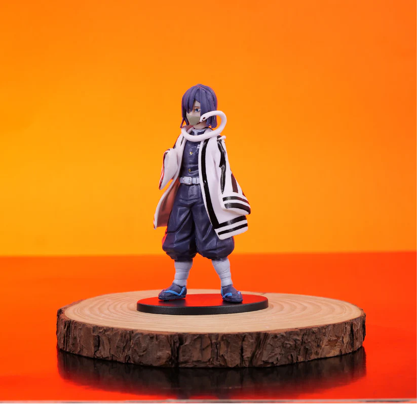 - Iconic Serpent Hashira Stance: Iguro stands tall in a vigilant pose, his heterochromatic eyes piercing through his signature bandages and mouth mask. His loyal snake companion, Kaburamaru, coils elegantly around his neck and shoulders, adding a touch of eerie elegance. The figure embodies his quiet intensity, with subtle bandages peeking from under his haori.