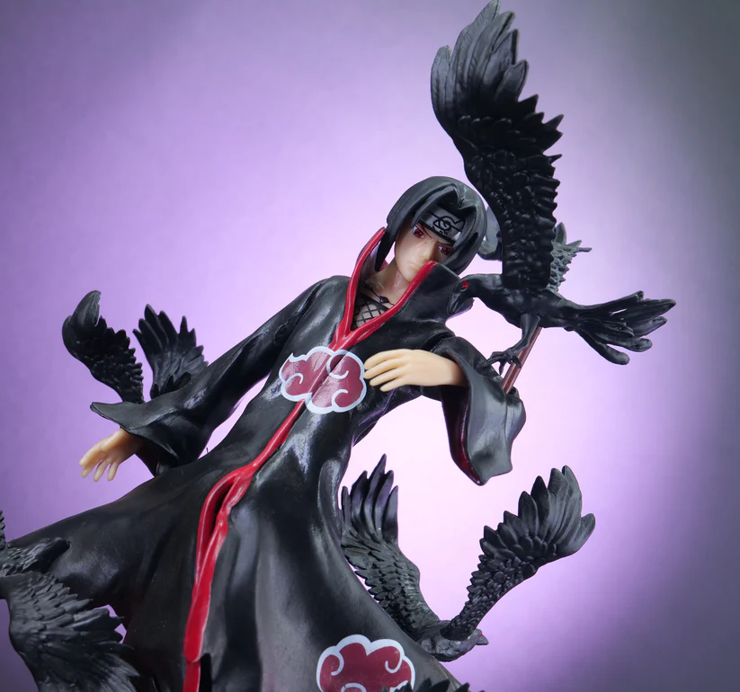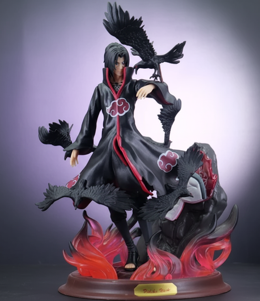 - Authentic Design & Detailing: Featuring Itachi in his iconic black Akatsuki cloak adorned with the signature red cloud emblem, complete with long black hair, piercing Sharingan eyes, and his signature forehead protector. The figure is surrounded by multiple realistic crows—Itachi’s signature summoning companions—perched on his arms and cloak, adding a layer of mystery and intensity. At the base, dramatic flames and rocky terrain evoke the fiery essence of his Amaterasu technique, creating a vivid scene straight from the anime.