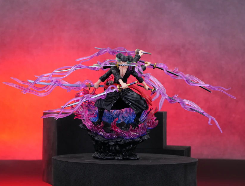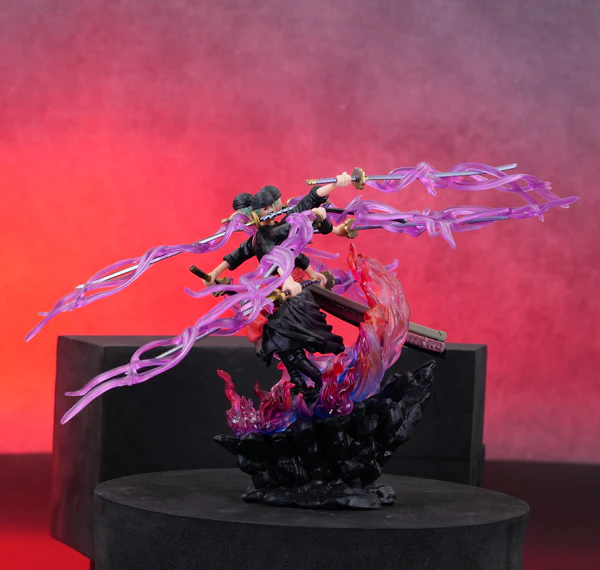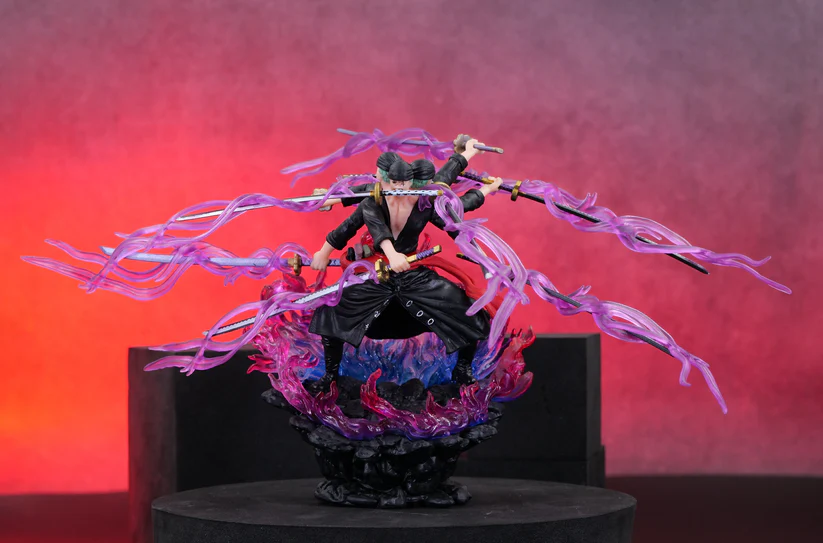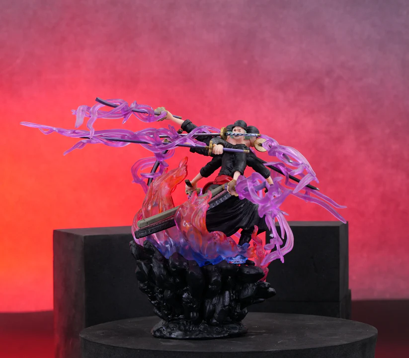 - Technique: He’s depicted using his signature Asura technique, which gives the illusion of him having three heads and six arms, for a total of nine swords. The purple, flowing auras around the swords represent his spiritual power, or Haki, being channeled.